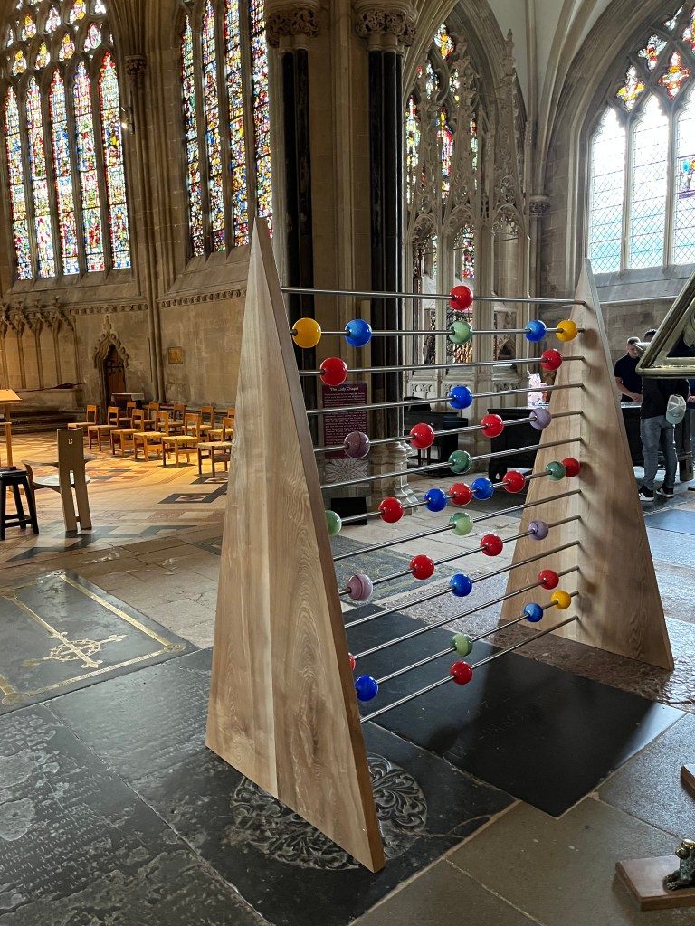 ‘Beings of Light’, 2023, Ash, stainless steel & hand-blown glass, H2m x L 1.92m x W1m, Installation at Wells Cathedral